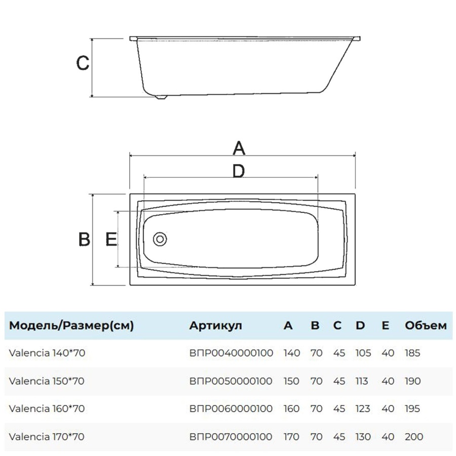 Ванна прямоугольная 170х70 белая ALBA SPA VALENCIA (ВПР0070000100)
